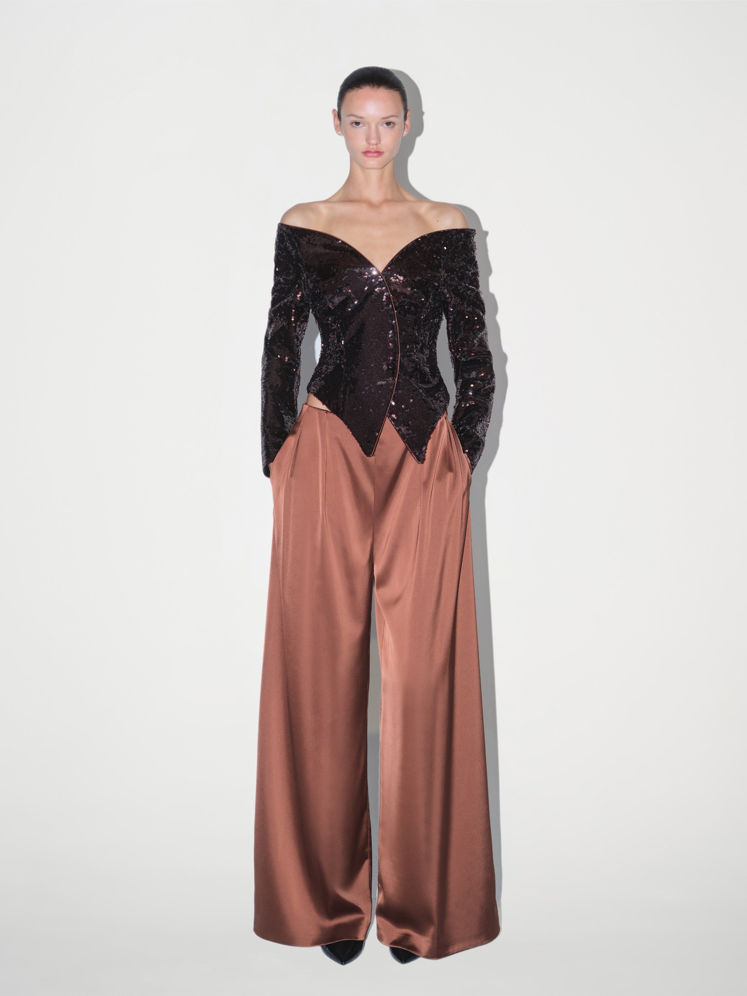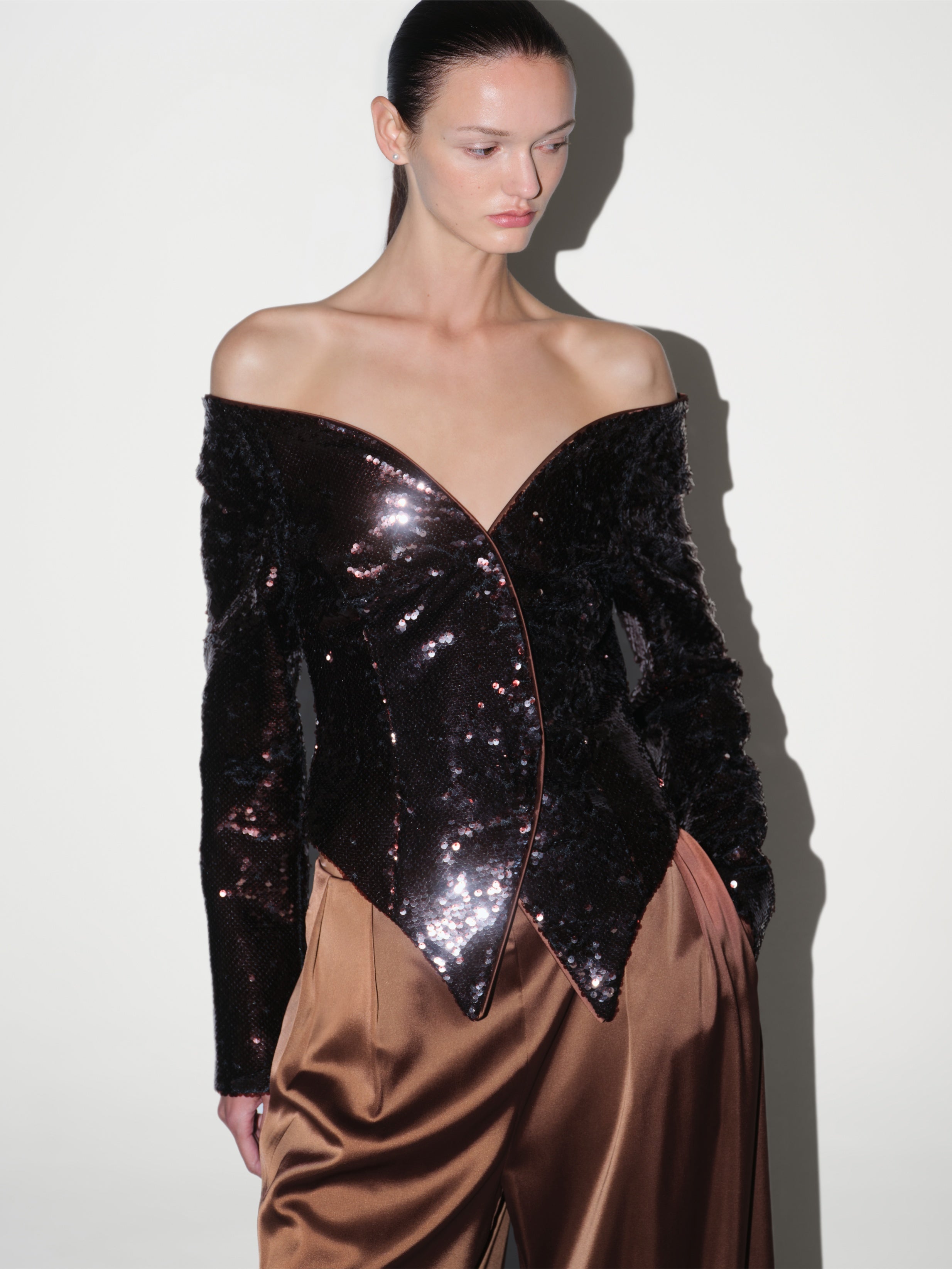 A statement piece in every sense, custom-crafted Nox Jacket is entirely embroidered with shimmering sequins that catch the light from every angle. Its structured cut cinches at the waist while the sharply tailored shoulders lend a sculptural finish. Lined with smooth satin for ease and comfort, it was designed to pair seamlessly with our brown satin trousers—but also layers beautifully over a slip dress for after-dark occasions.