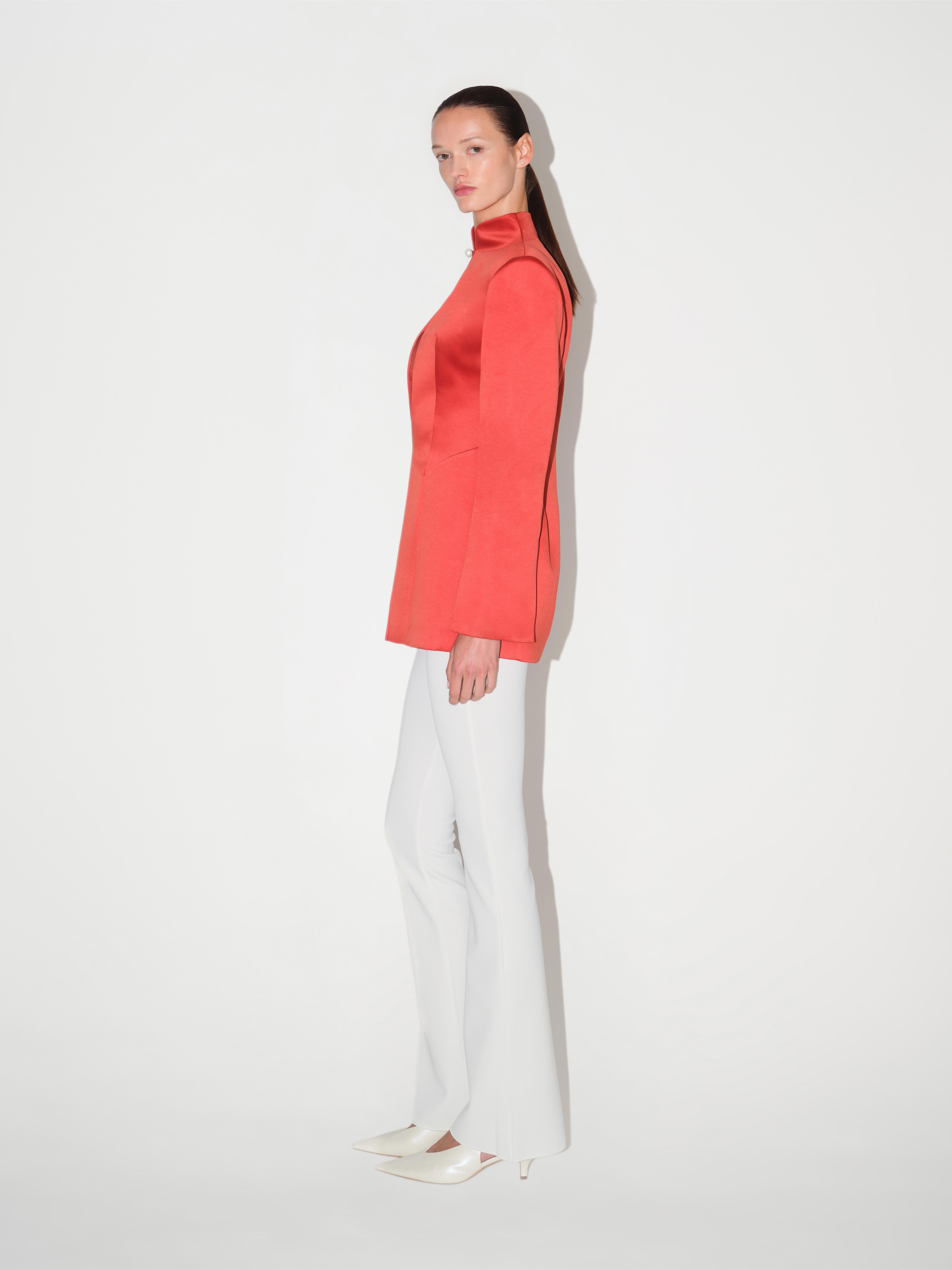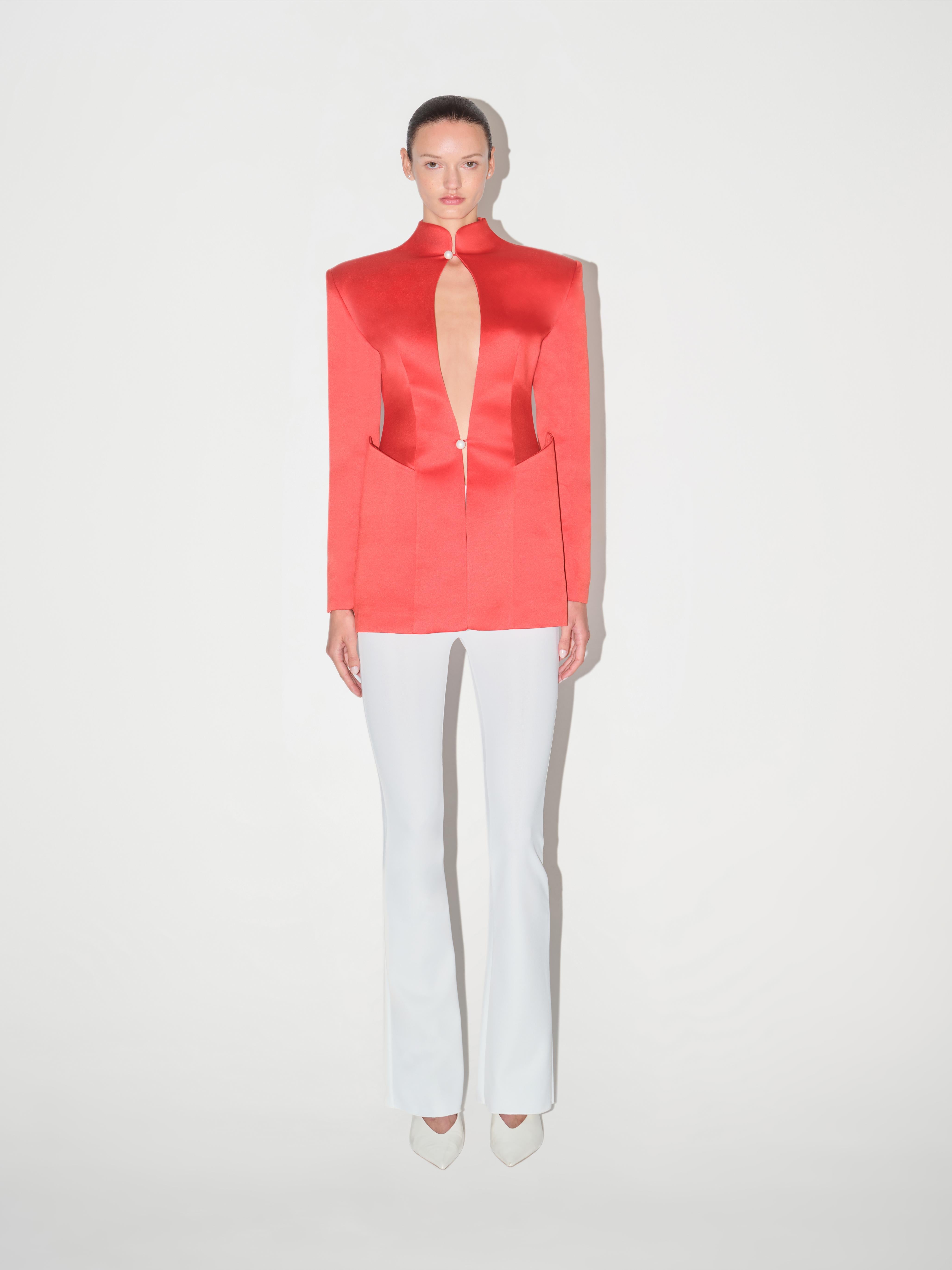 The Vesper Jacket is cut from vivid red satin and defined by its sharp shoulders, structured fit, and pearl closures that add contrast to its clean, sculptural lines.