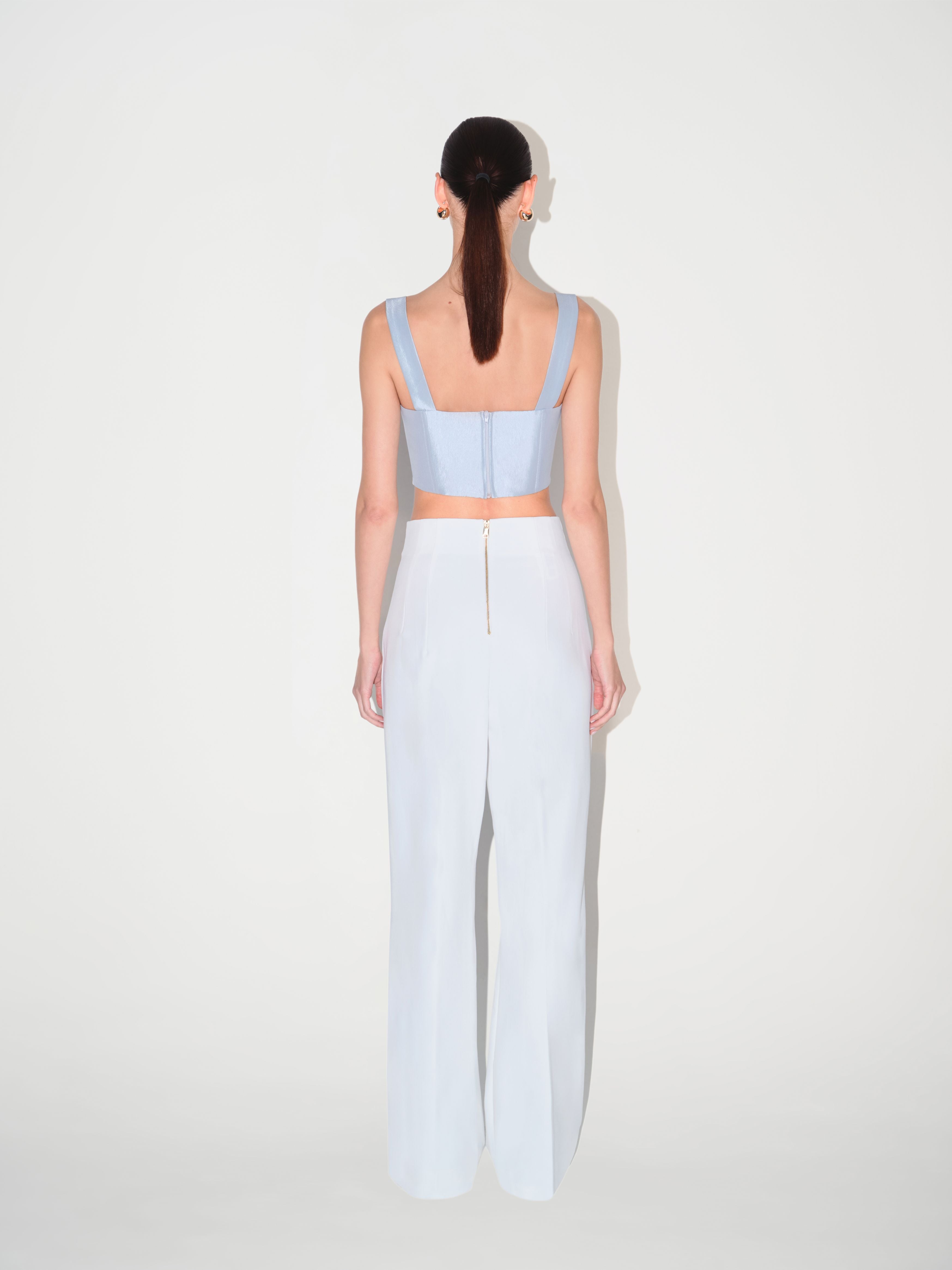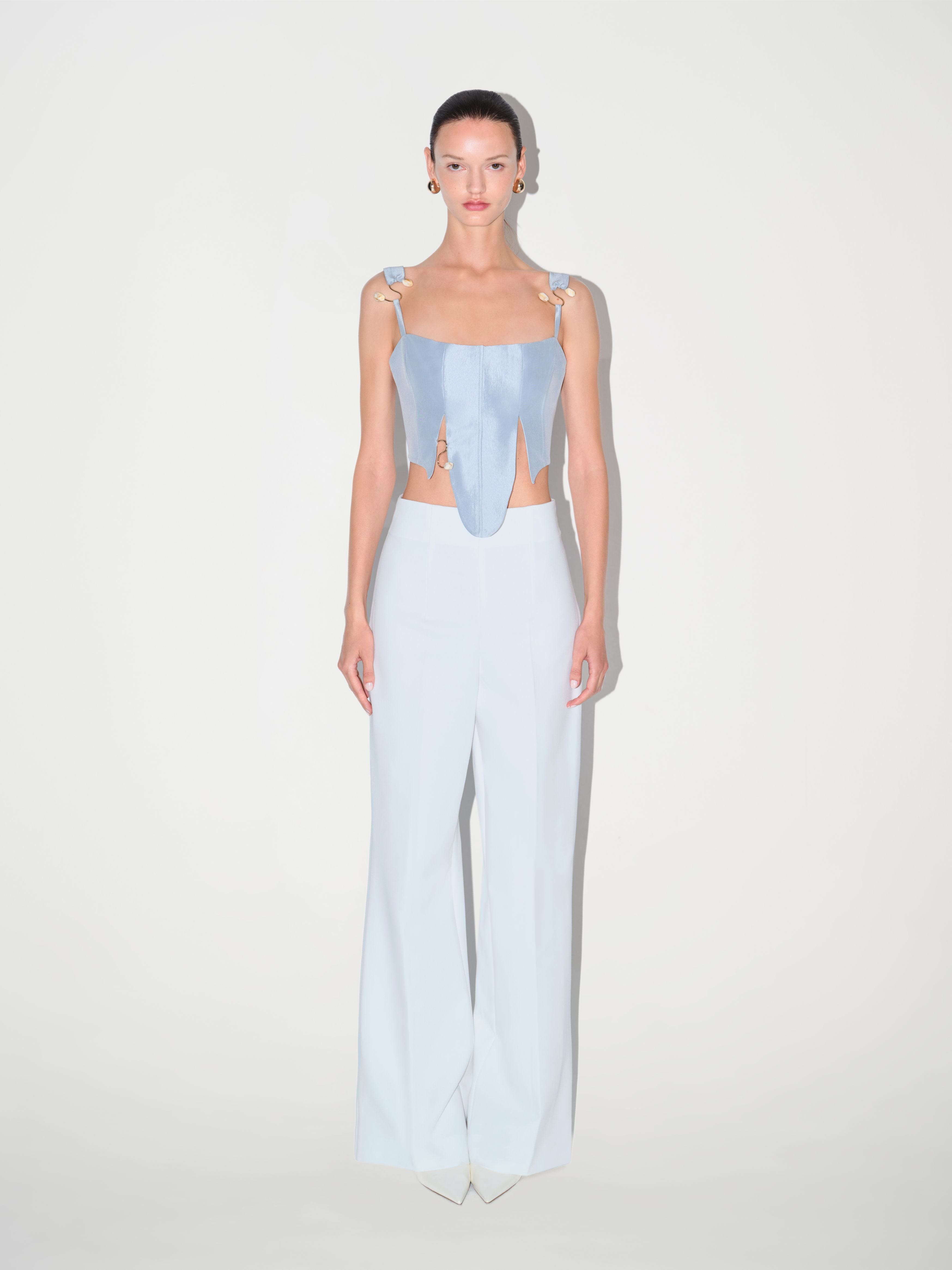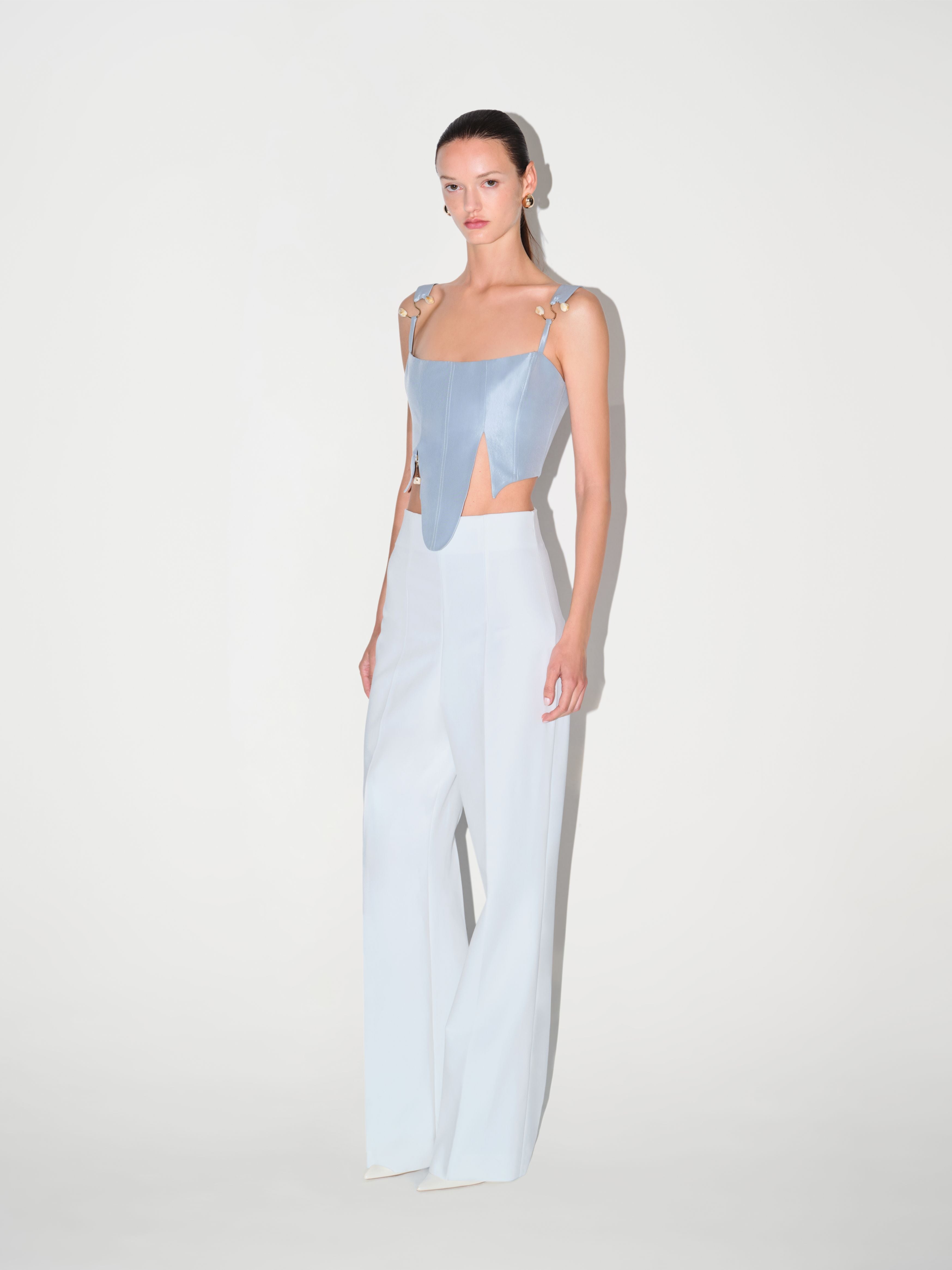 The Amelia Corset in blue is detailed with carefully selected beaded accessories that add texture and depth. The structured fit is softened by two front slits that bring movement to the design. Wear it with high-waisted wide-leg trousers for a sculpted silhouette or pair it with a fitted pencil skirt for an elegant balance.