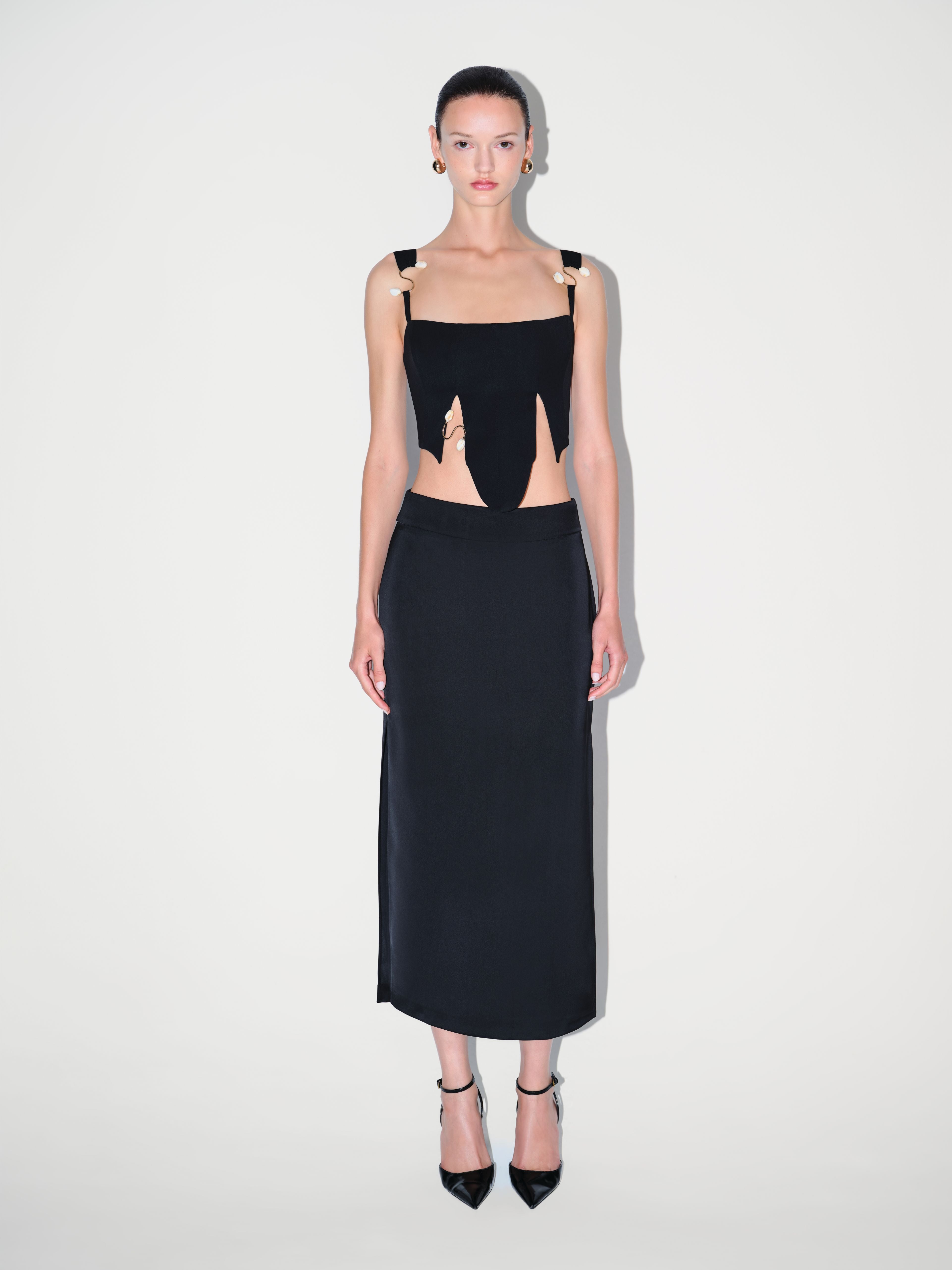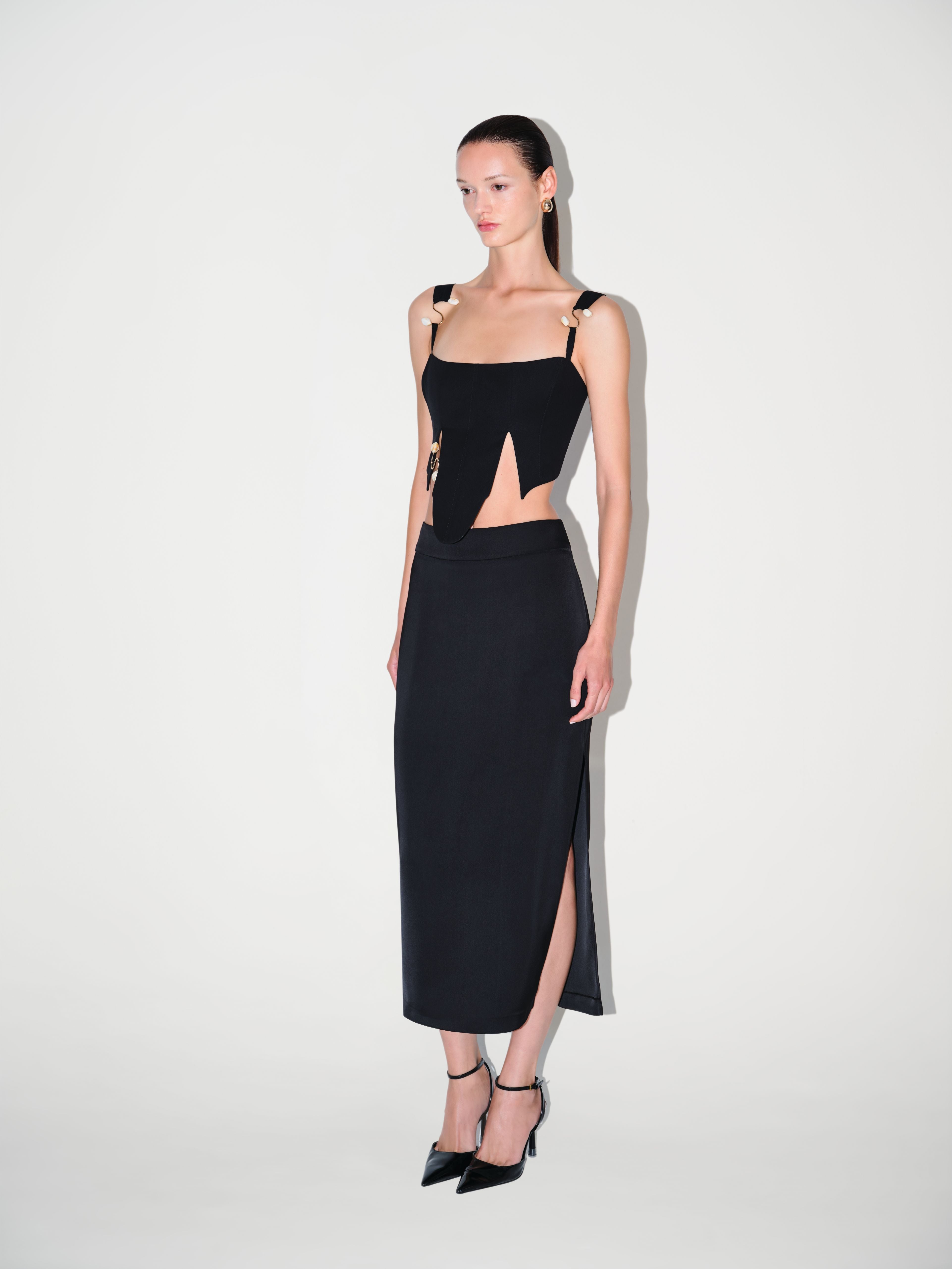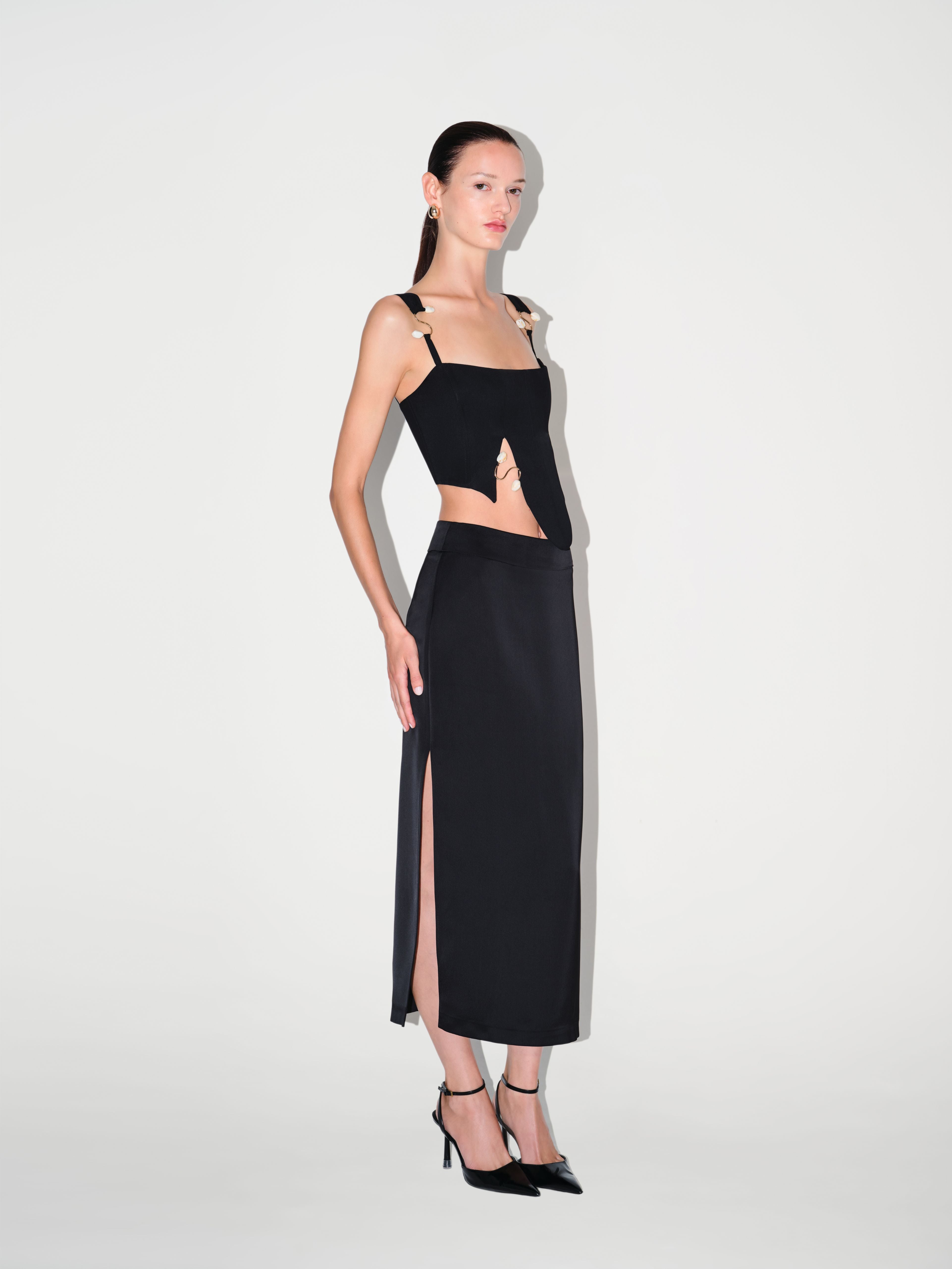 The Amelia Corset features beaded accents that add texture and detail. Its structured shape is softened by front slits that bring ease and movement.
