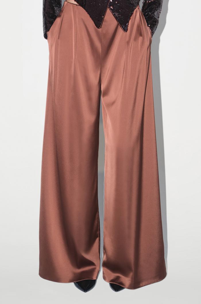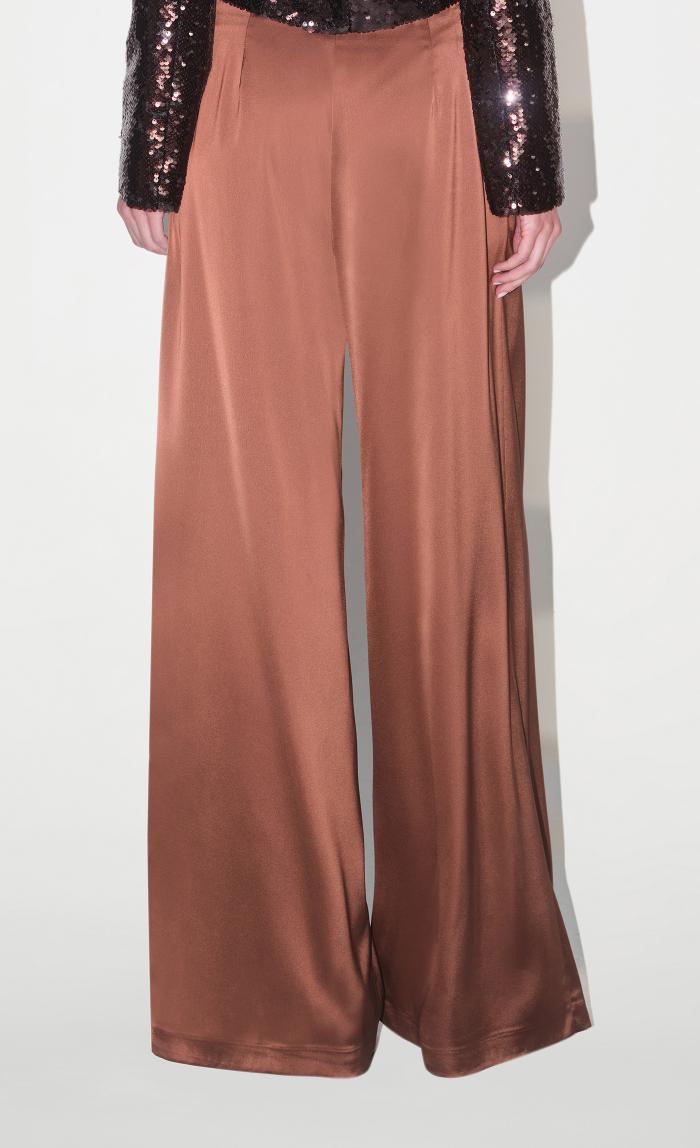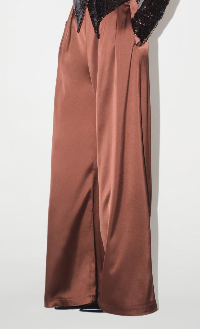 Crafted from smooth, flowing satin, the Eve Trousers feature soft pleats at the waist and a relaxed, elegant drape. The side zipper closure is discreetly hidden, maintaining a clean and uninterrupted silhouette. The rich brown hue pairs beautifully with matching textures—especially our sequin-embellished jacket—for a grounded yet elevated ensemble.